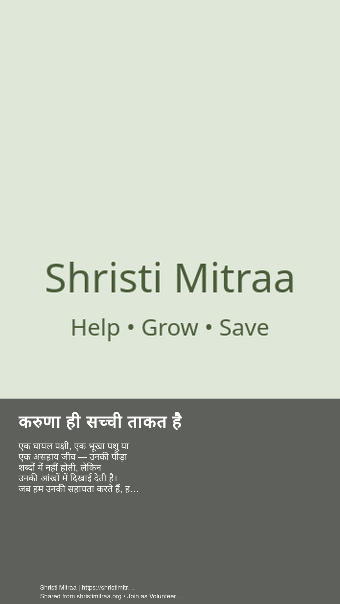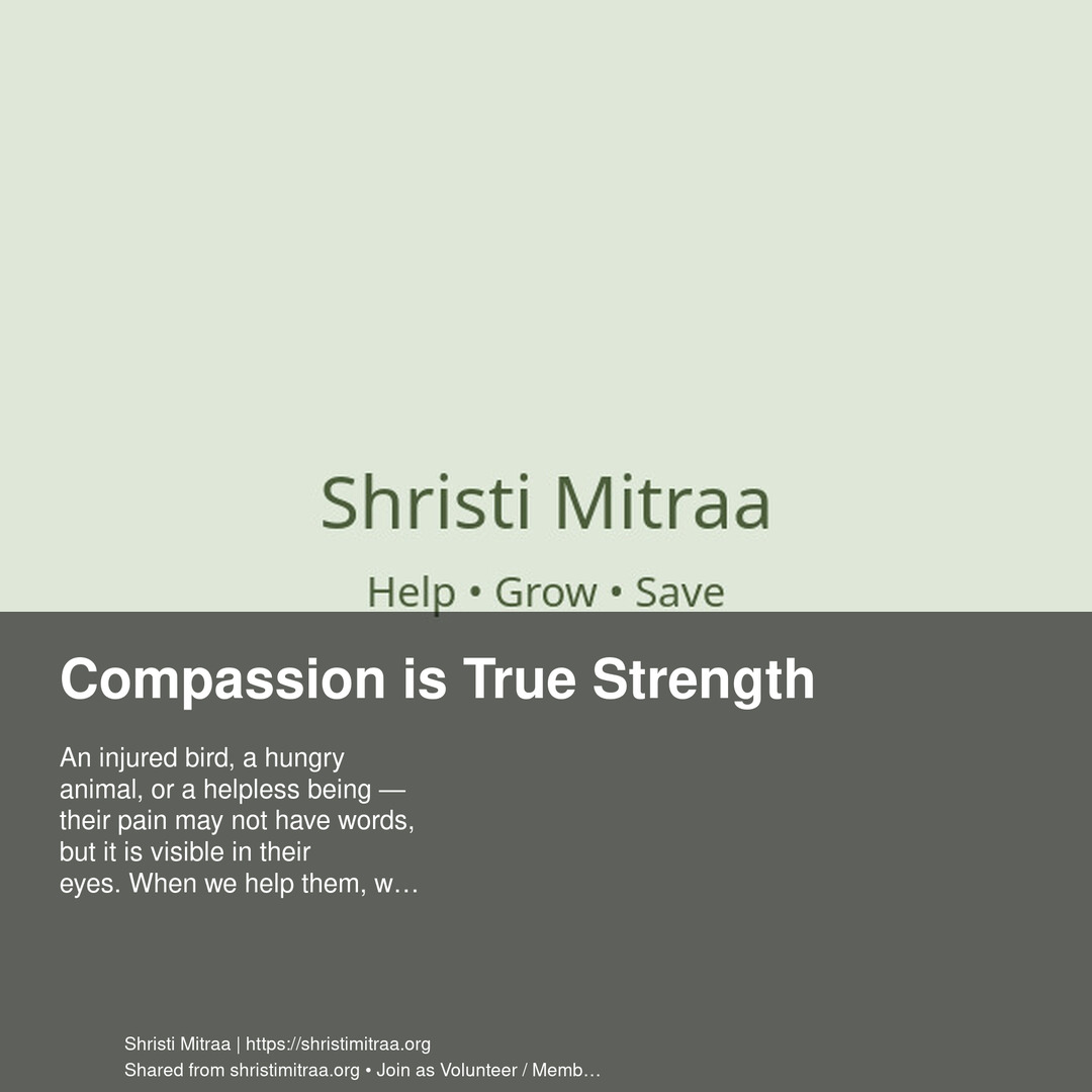 एक घायल पक्षी, एक भूखा पशु या एक असहाय जीव — उनकी पीड़ा शब्दों में नहीं होती, लेकिन उनकी आंखों में दिखाई देती है। जब हम उनकी सहायता करते हैं, हम केवल सेवा नहीं करते, हम मानवता को जीवित रखते हैं। Shristi Mitraa का संदेश है — Help • Grow • Save.