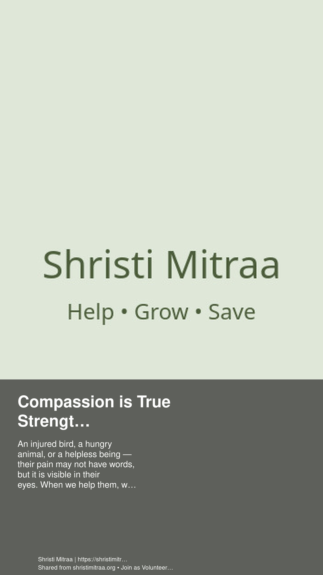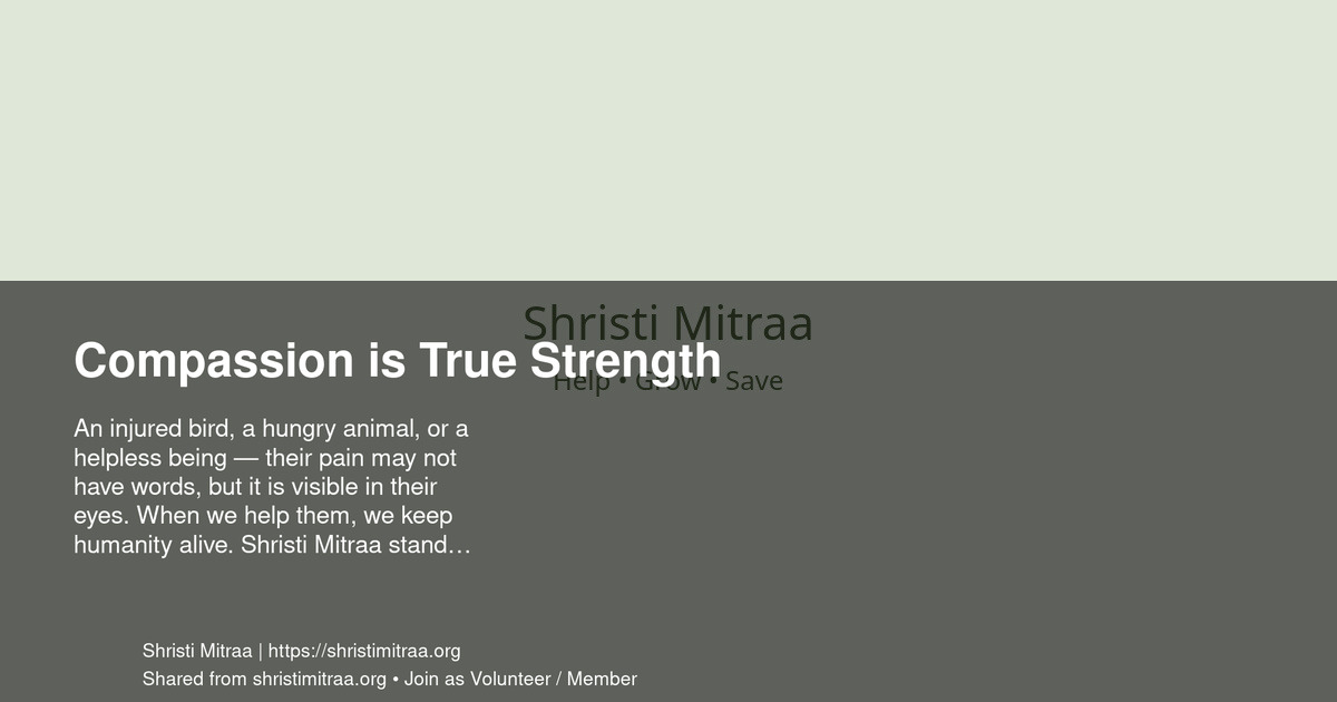 An injured bird, a hungry animal, or a helpless being — their pain may not have words, but it is visible in their eyes. When we help them, we keep humanity alive. Shristi Mitraa stands for Help • Grow • Save.