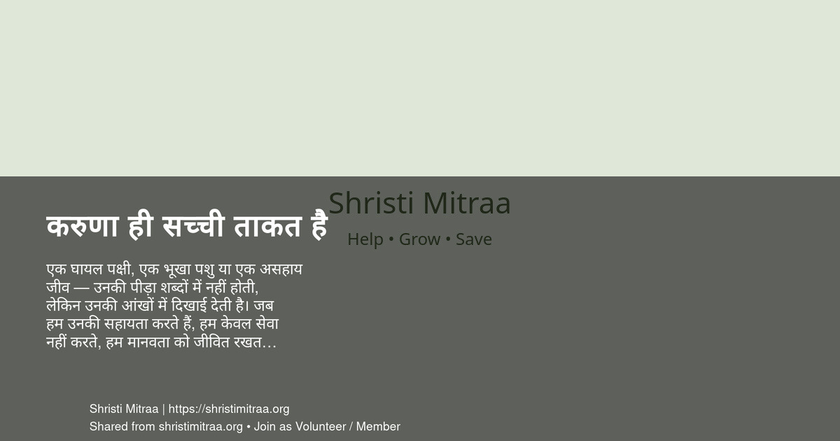 एक घायल पक्षी, एक भूखा पशु या एक असहाय जीव — उनकी पीड़ा शब्दों में नहीं होती, लेकिन उनकी आंखों में दिखाई देती है। जब हम उनकी सहायता करते हैं, हम केवल सेवा नहीं करते, हम मानवता को जीवित रखते हैं। Shristi Mitraa का संदेश है — Help • Grow • Save.