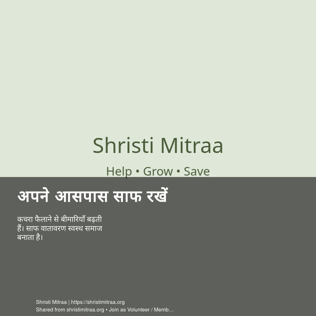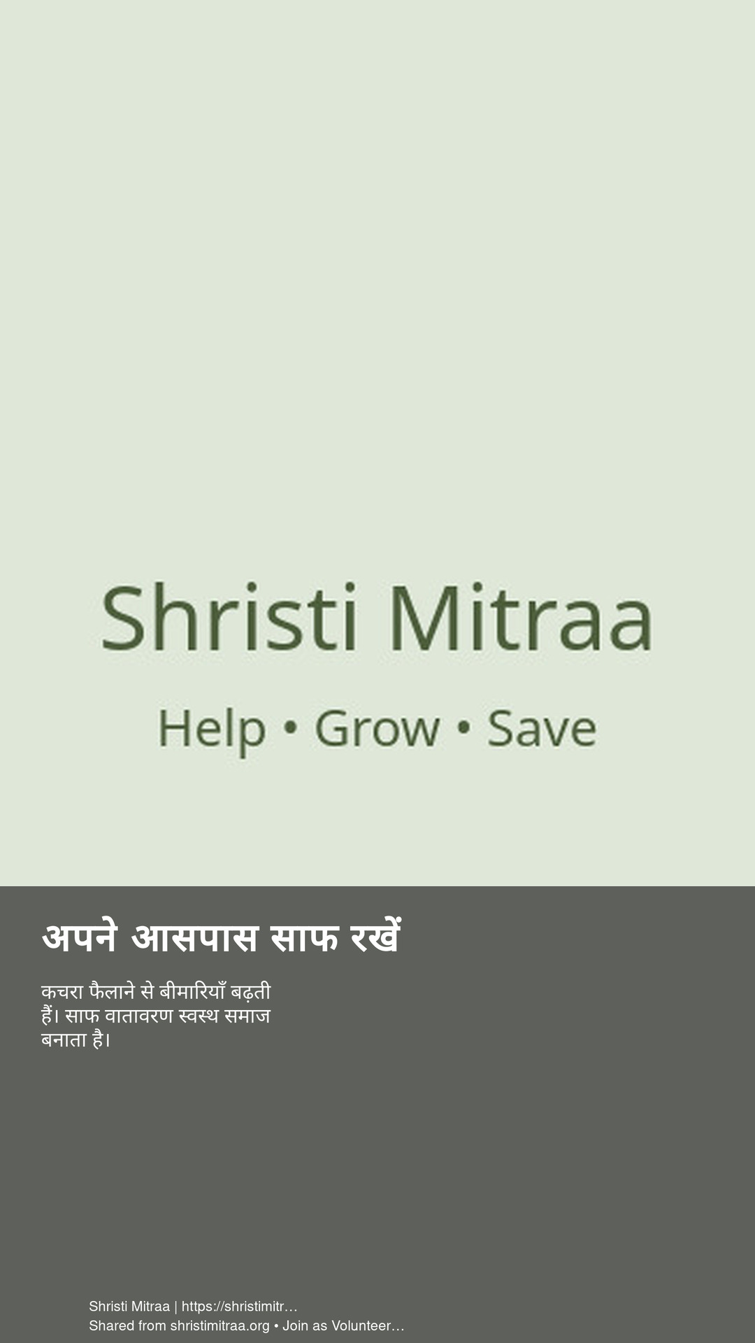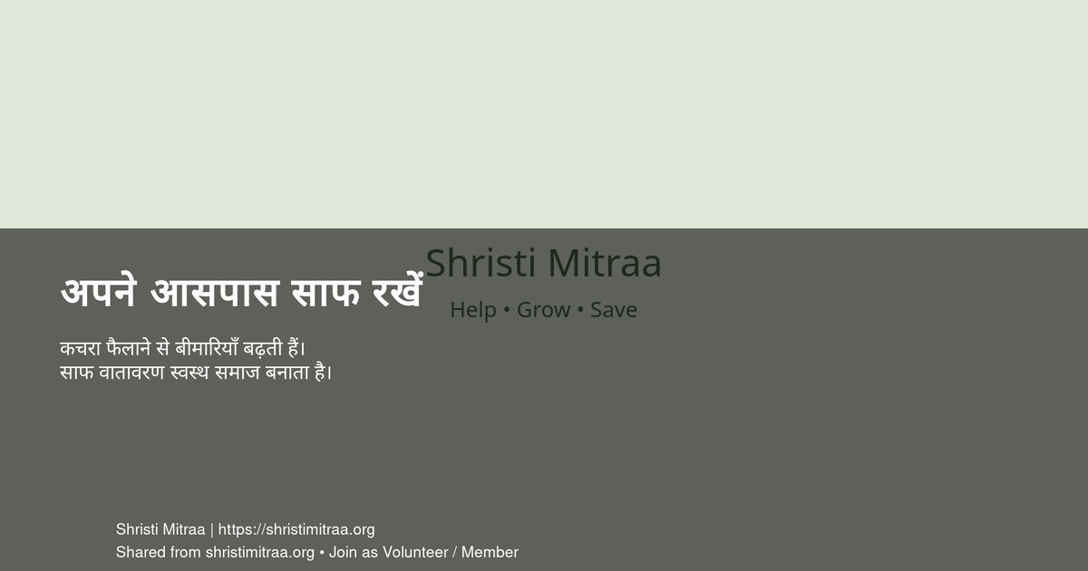 कचरा फैलाने से बीमारियाँ बढ़ती हैं। साफ वातावरण स्वस्थ समाज बनाता है।